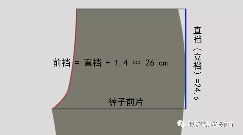如此,若得知直襠和總襠,便可估算前襠與后襠,假設(shè)褲子的直襠為24.6cm,那么,前襠尺寸≈直襠+1.4cm=26cm,后襠等于總襠(通襠)減去前襠長(zhǎng)。