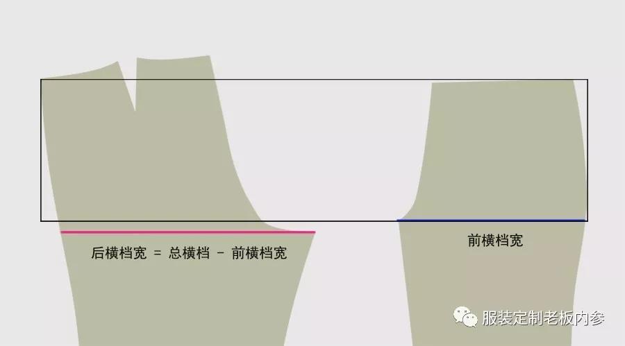 但若定制店規(guī)定了直襠與橫檔的尺寸,那么,后橫襠就要根據(jù)前橫襠尺寸確定,由總橫襠減去前橫襠,得到后橫襠寬的尺寸。
