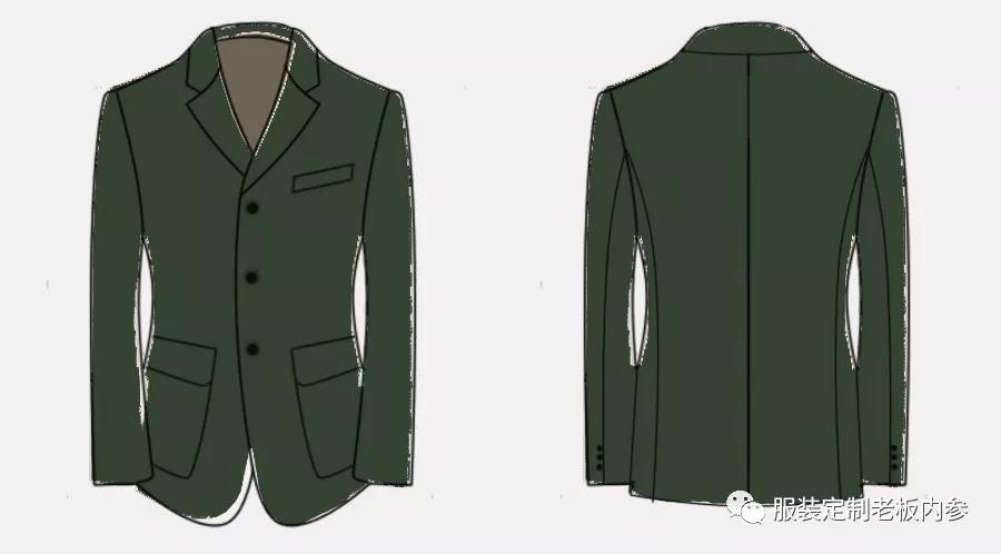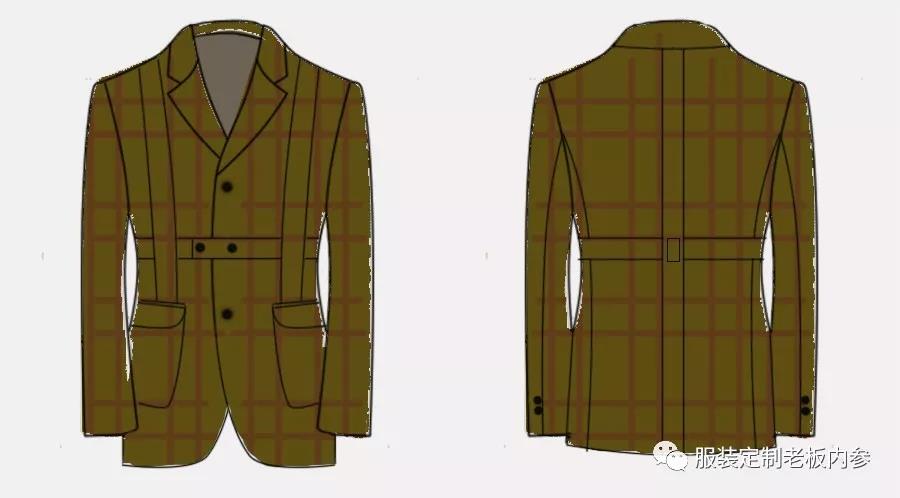 運(yùn)動夾克西裝由于起源于狩獵運(yùn)動,受到諾弗克夾克影響,其款式有諾弗克的痕跡,造型多為胸前無省的H型造型。