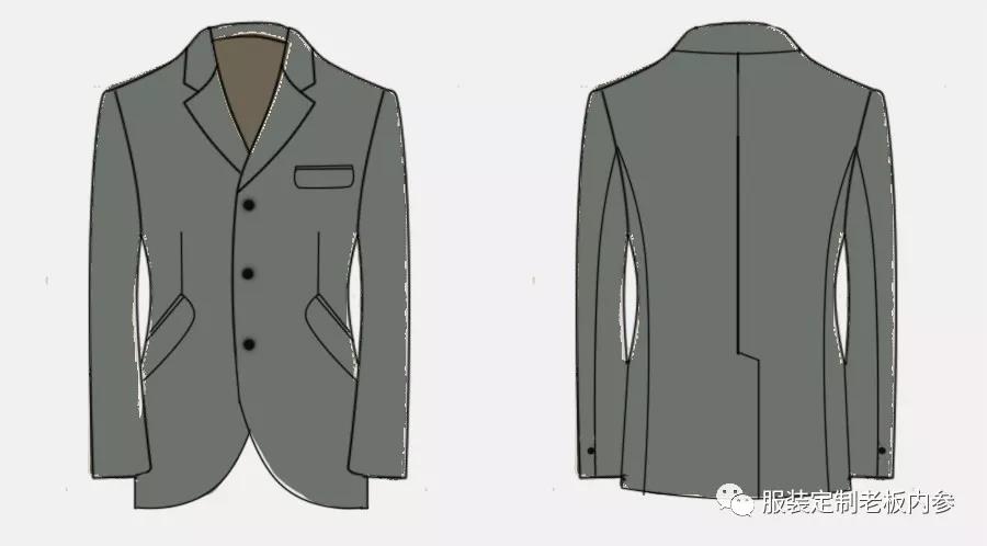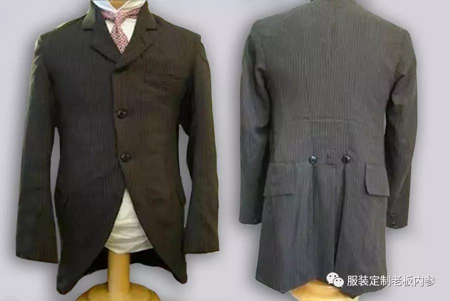 競技夾克西裝受晨禮服影響較大,其款式多為收腰,下擺圓弧較大,單排三??凼沟妙I(lǐng)口較淺,腰兜斜插袋蓋型,胸兜袋蓋或船型,袖扣一粒,后身刀背結(jié)構(gòu)、明開叉等,都有晨禮服的結(jié)構(gòu)痕跡特征。