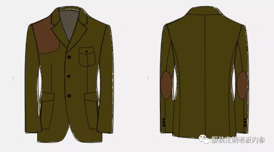 狩獵夾克西裝的傳統(tǒng)面料,一般使用用海力蒙和大格粗呢面料,基于握槍動作,其袖肘和右肩會增加麂皮補(bǔ)丁,這也算它的一大特色了。