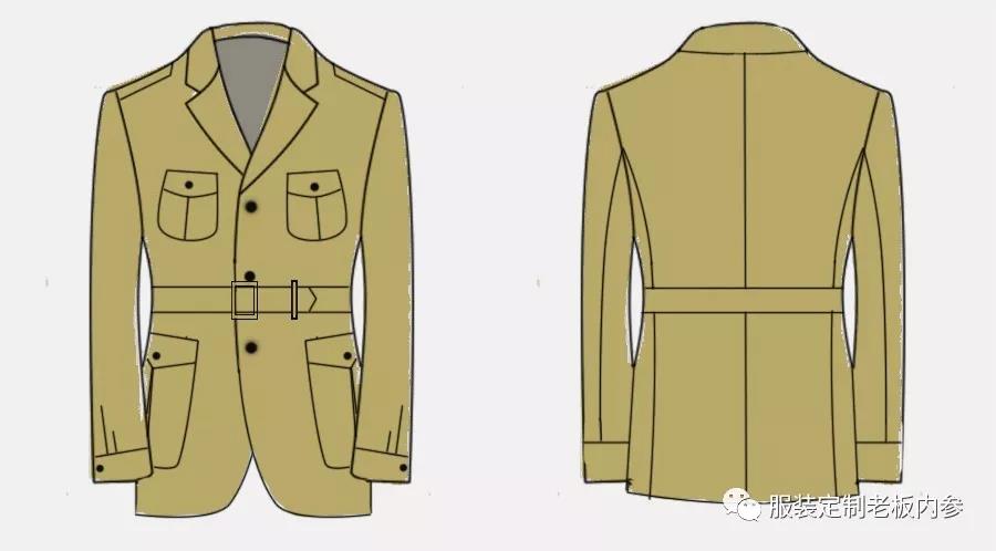 旅行夾克西裝的主體結(jié)構(gòu)與襯衣相仿,袖頭可仿照襯衫卡夫制作,也可按西裝袖叉的做法,腰帶、肩襻、胸兜和腰兜等,有軍服的特點(diǎn)。